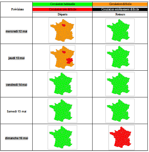 Mercredi 12 mai, le trafic sera dense dans le sens des départs, ce mercredi est classé orange au niveau national. En Île-de-France, la circulation sera très dense en direction des barrières de péage des autoroutes A10 et A6 dès la fin de la matinée et, dans l’après-midi, des difficultés de circulation sont attendues sur l’autoroute A13 et les principales radiales et rocades convergents vers les autoroutes A6 et A10, jusqu’en début de soirée.